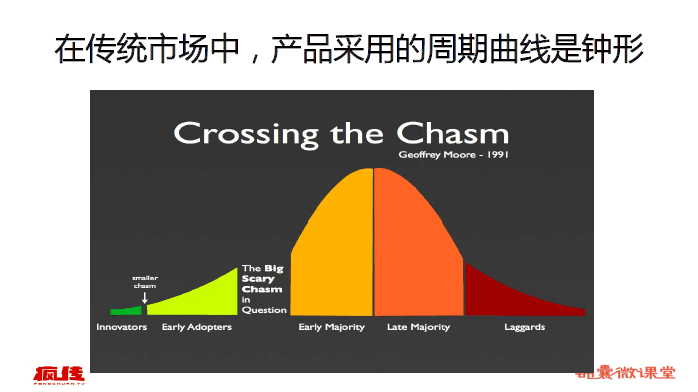 这张图是跨越鸿沟的一张图。在传统的市场中,一个新的产品被市场采用的周期的过程。最开始是创新者,一个新产品出现之后,一些尝鲜者就会去大胆的尝试。第二阶段就是一些早期的采用者,第三阶段是晚期的采用者。而早晚期之间是存在鸿沟的。