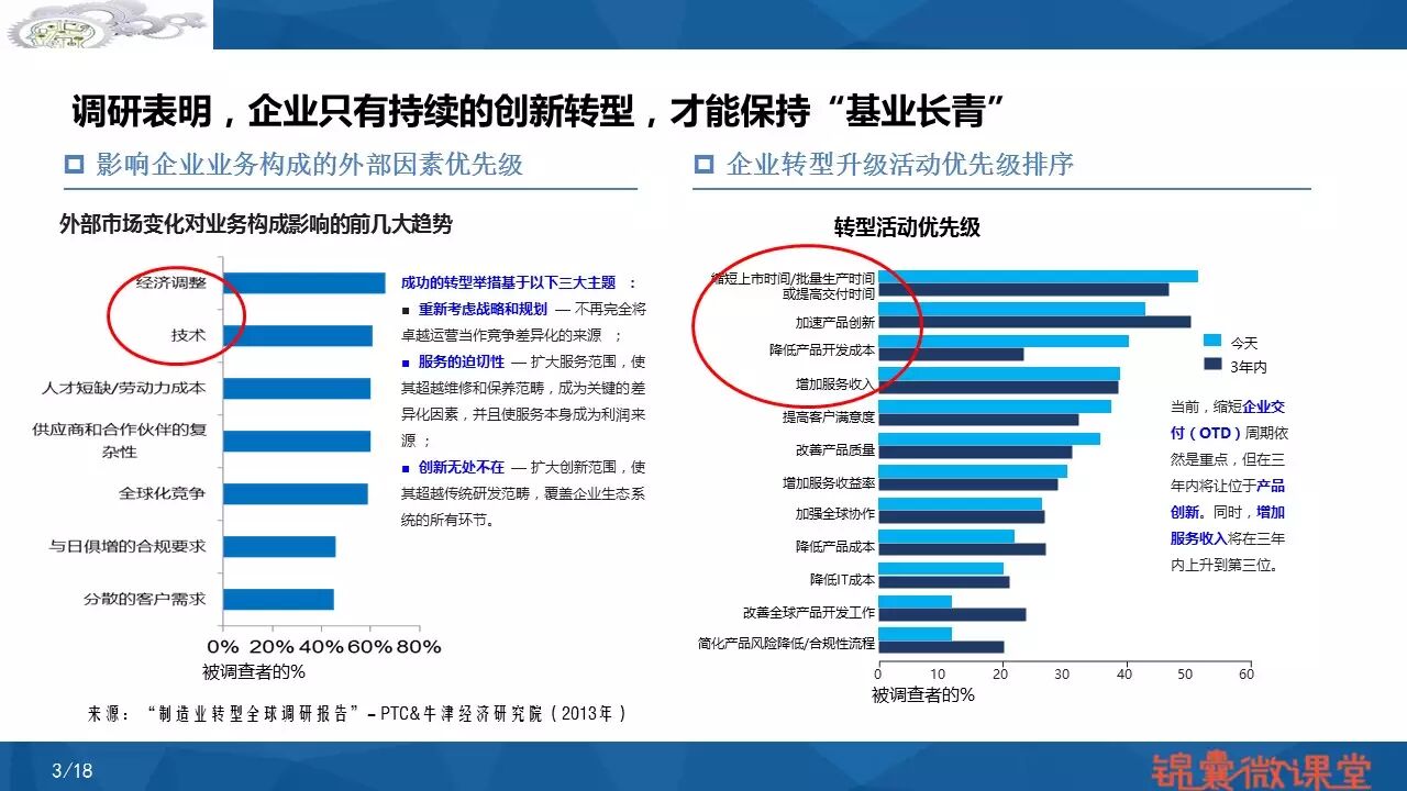 大家一起看一份来自于PTC&牛津经济研究院(2013年)关于:“制造业转型全球调研报告”的调研表明,企业只有持续的创新转型,才能保持“基业长青”。