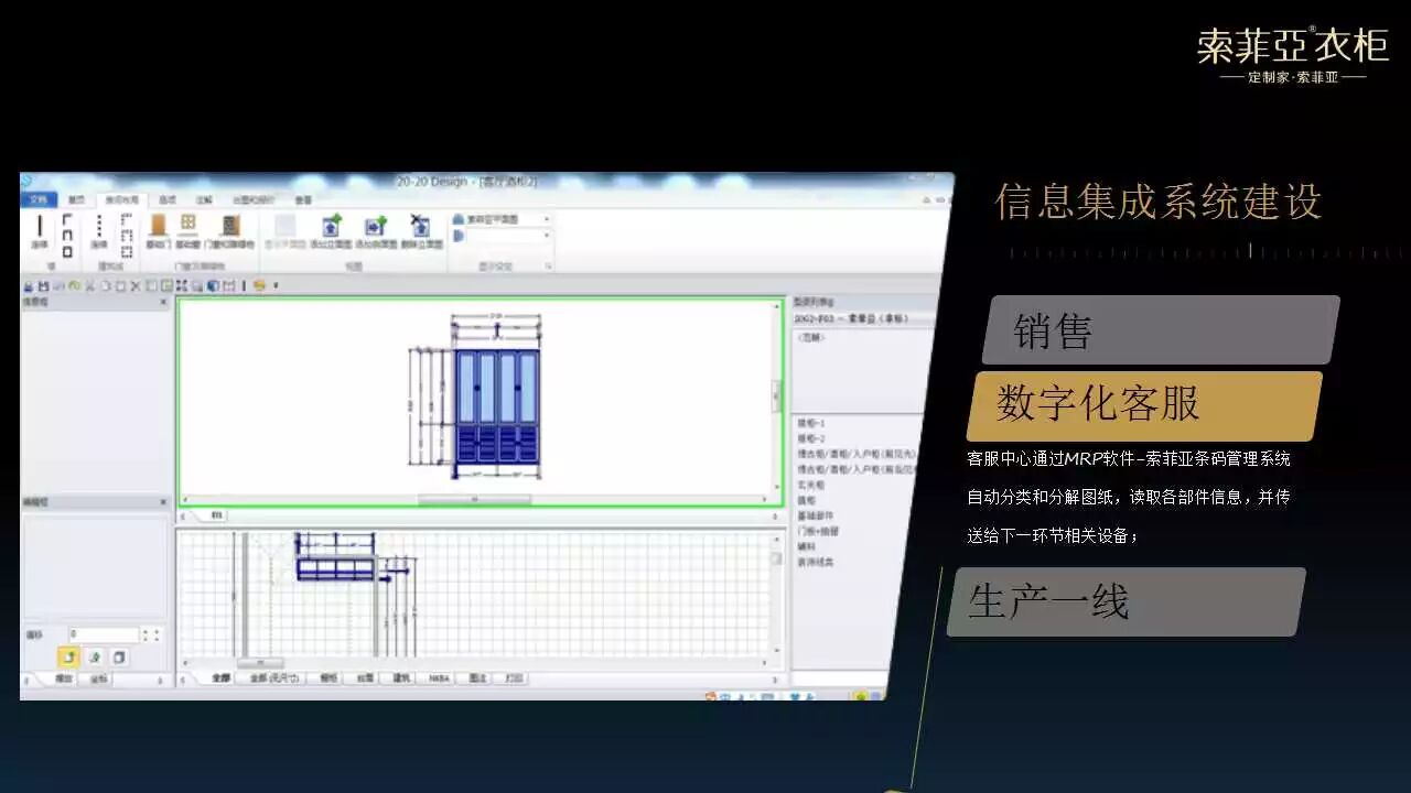 要完成这个我们需要做到内部信息化的提高,是把所有的产品先变成数据。到了工场是6000张的图纸,不同的柜子,到工厂之后全部都变成了数据。我们有个前端,就是把这些图纸变成数据。那么以后车间的工人不知道这个柜子,现在数据就解决了。以前我们的工人是要看图纸的,凭木工经验把这个工作完成。现在很多的工序很多都是机器完成,工人看到的是一块块大小不同的板件。