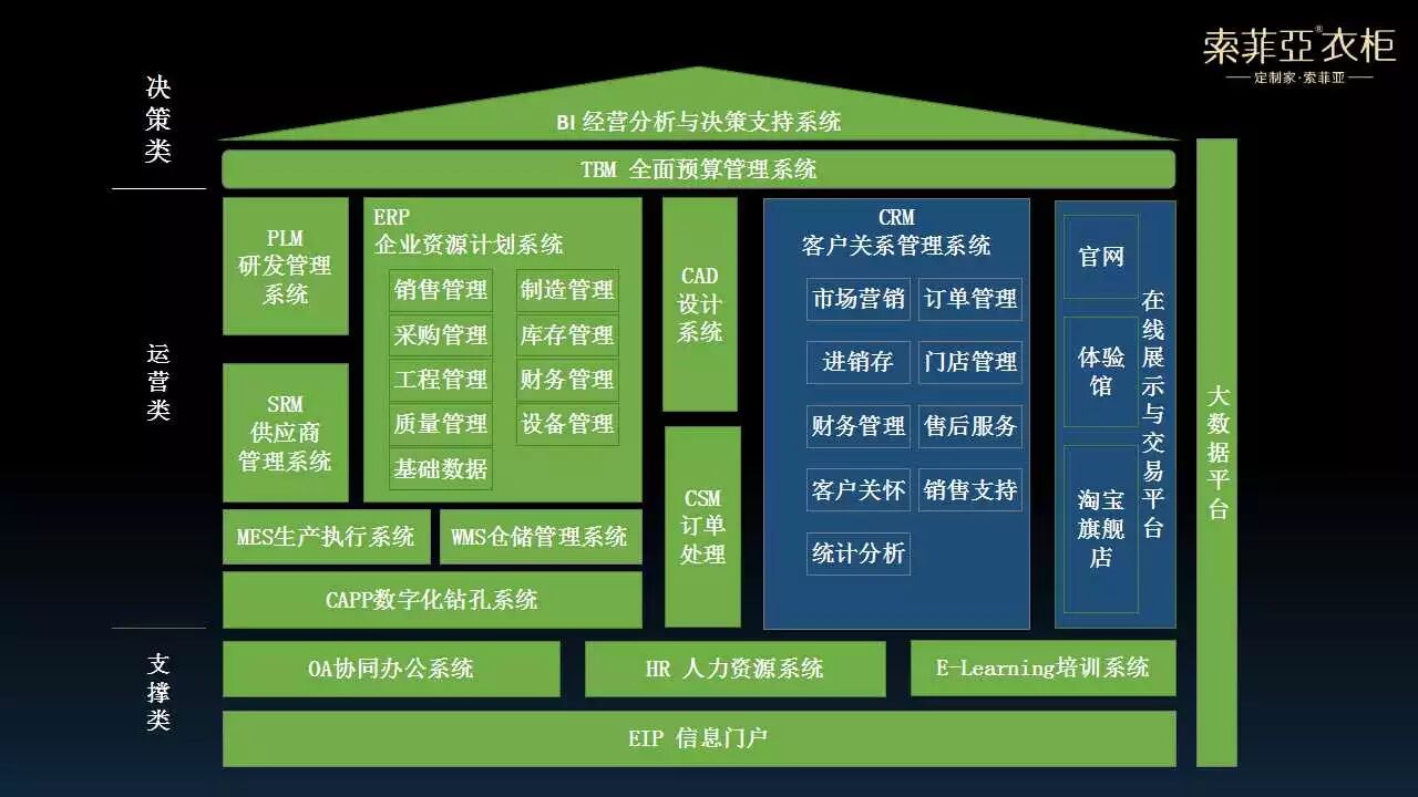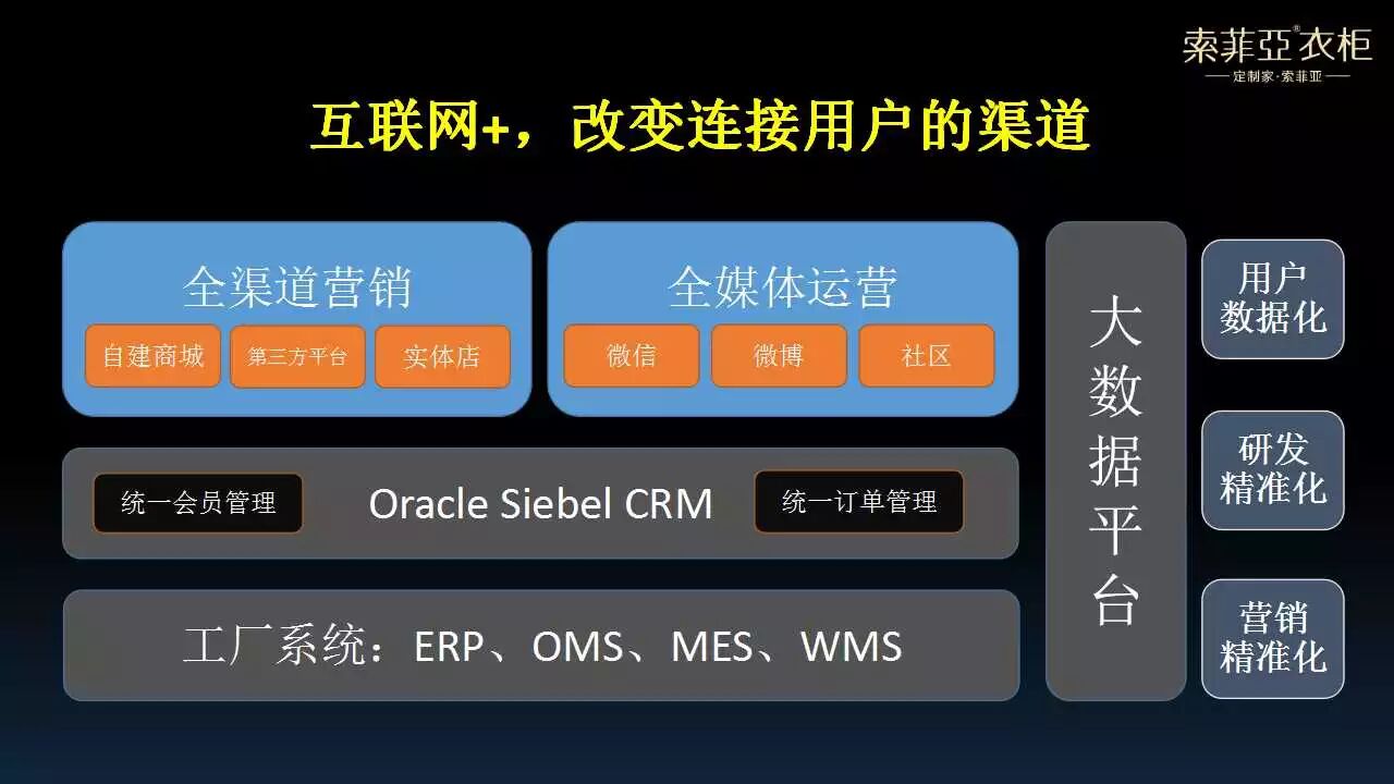 我们除了后来要做到信息化外,还有我们的前台,还有消费习惯改变。所以我们现在很注重网上的消费者来源,前年我们开始做,在今年应该是取得了很大进步。每年都是好几倍的增长,现在我们在前端做到全渠道的营销,也有了自己的自建商城,线下的实体店有一千多家,配合后台的ERP,订单管理和生产管理还有仓库管理,我们今年开始做智能仓。以后我们的工厂都跟智能仓配合,有了这些基础之后,现在开始做营销的精准化。广告的投入是非常注重这方面的结果,研发我们也根据顾客的需求,顾客对我们的需求,年龄,职业分析我们都可以做到了。我们的电商是服务,因为定制就是要把服务做好,定制这部分是互联网的冲击是稍微要迟一点的,但也给了我们很多的时间。