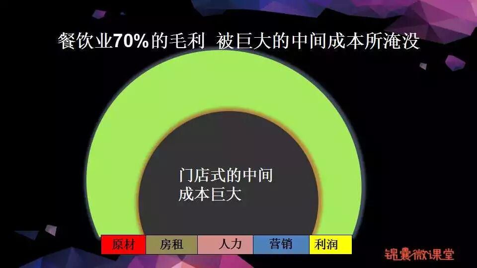 我们在忍受这些地段和入口一次又一次的敲诈后 ,你发现你所承担着成本越来越高,餐饮业70%的毛利 被巨大的中间成本所淹没,70%毛利交给了房租,劳动力成本 ,和推广成本。