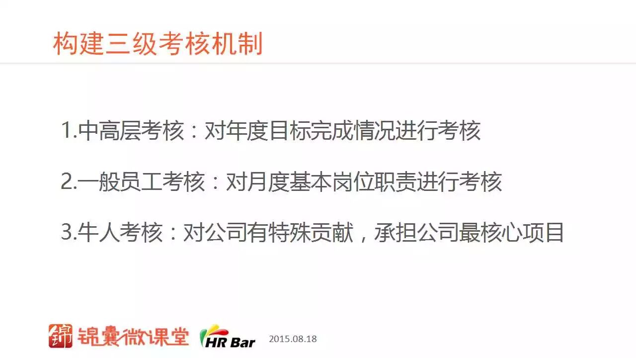 最后着重要说的是对牛人的考核。传统的考核是考核部门贺员工岗位,但是没有考虑到牛人。牛人是指在公司里面有特殊贡献的人,承担公司最重要的一批项目。所以对这部分人的考核、奖金项目一定要设计到位。