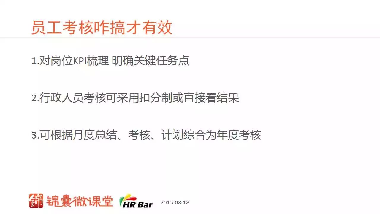 本周二,锦囊微课堂有幸请到了HR Bar人力资源学院的院长刘建华老师为我们讲了一堂“如何构建富有成效的绩效体系?”的课程。本次课程,刘老师从几方面深入为大家解读了企业应该如何构建、完善自己的考核机制。现在小锦已经把刘老师的讲课内容整理成文,满满的干货,快来学习吧!