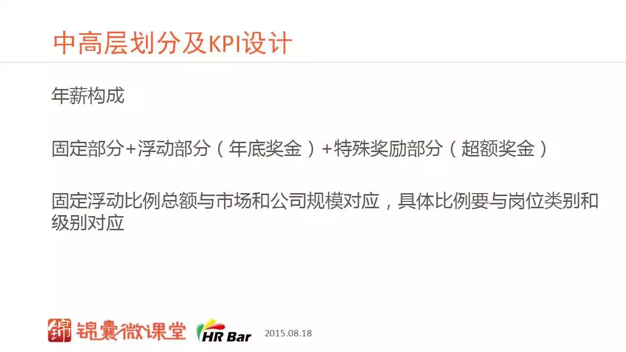 首先对第一个年度招聘任务负责,所以你的考核指标是为公司招聘了牛人多少和?招聘了一般人员多少个?第二是储备牛人多少个,储备的核心员工多少个?就是来应聘了,但是却暂时上不了班的。这个数量也是考核需要看的。所以考核的时候,更多的岗位KPI一定要从岗位的关键人物来出手,从岗位的关键存在价值来出手。然后考核的指标找到,根据不同的岗位类别,不同的岗位等级的不同设计,这是岗位KPI梳理。