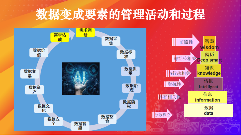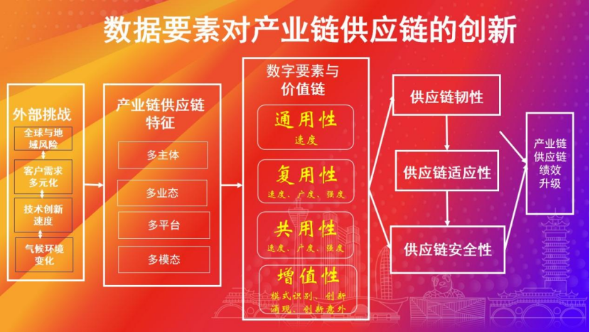 在数据要素方面,如何将数据真正转化为提高生产力的要素,既是一个理论问题,也是一个现实问题。数据自身的空转是难以成为要素的,只有与决策需求、业务流程、专业岗位和特定场景紧密结合并改变其以往的高成本、低效率和频繁出错,并为个人、企业、政府创造实际价值,数据才能真正转变为要素。在数据转换成要素时,数据标准、数据质量和数据治理是关键。要使数据要素在企业价值链上发挥重要作用,需对其特征有深刻的理解。我将其特征总结为“四性”:通用性、复用性、共用性和增值性。通用性是确保数据互联互通的基础,包括行业标准、语料构建、标识解析;复用性是已有的数据可重复利用,通过动态编排、无限重构达到降本增效提质的作用;共用性改变了以往企业线性流程和价值链的底层逻辑,通过数据共享机制支持供应链成员的实时协同和闭环管理,大大缩短产品研发周期,减少不必要的试错;增值性是在纵向和横向层面,实现从数据到信息、情报和知识的持续增值,通过异构数据整合分析、数据与人的知识经验协同、数据与实体运营体系的协同共创,不断寻求增值的空间和机会。