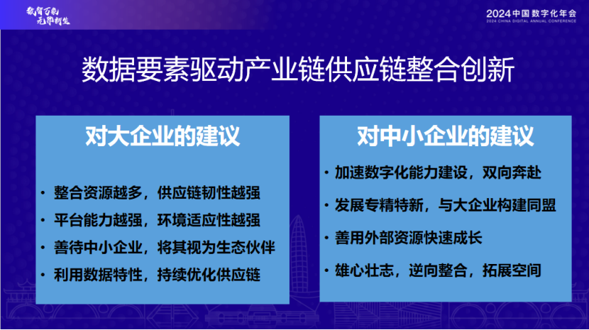 数字要素驱动需要突破式创新。上述能力的实现并非自然形成,需要企业领导者的思维突破和创新探索,其中,大企业应该开放自身数字化能力,善待中小企业,将其视为生态伙伴,并利用数据特性,持续优化供应链;中小企业应该抓住与大型企业的合作机会,加速数字化能力建设,发展专精特新,成为供应链产业链中的关键一环,善用外部资源实现快速成长,并实现逆向整合,全力打造第二增长曲线。
