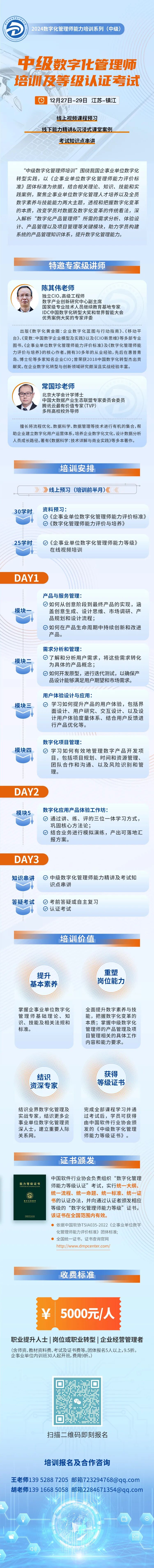 “中级数字化管理师培训及等级认证考试”(江苏-镇江站)将于12月27日-29日举办。本次培训围绕我国企事业单位数字化转型实践,以《企事业单位数字化管理师能力评价标准》团体标准为依据,结合相关理论、知识、技能和实践案例,聚焦企事业单位数字化管理人才培养以及全员数字素养与技能能力两大主题,透视和把握数字化变革的本质,改变学员对数据及数字化变革的传统看法,深入解析“数字化产品管理师”所需的需求分析、体验设计、产品管理以及项目管理等关键模块,助力学员构建系统的产品管理知识体系,提升数字化管理能力。