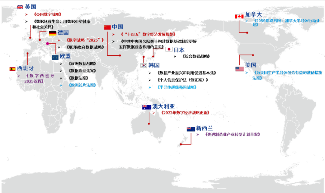 近期,全球各国都分别发布了数字经济相关文件和政策。除此之外,美国还发布了先后发布了《为人工智能做好准备》《国家人工智能研究与发展战略计划》《维护美国人工智能领导地位的行政指令》;欧盟近期先后颁布了一系列具有影响力的数字标准,颁布了《通用数据保护条例》,该条例得了广泛认可,巴西、日本、南非等国引用相关条例,甚至在实践中采用了相关准则;印度政府提出“印度制造计划”;越南也提出了数字经济作为作家战略的优先事项。