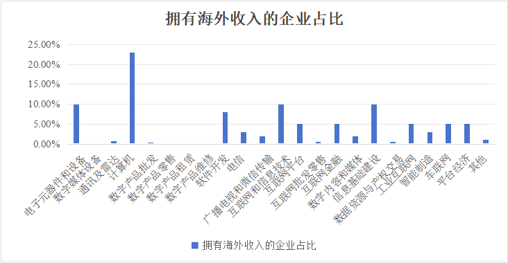 电子元器件和设备、计算机、软件开发、互联网和信息技术、信息基础建设、工业互联网、车联网、平台经济行业企业出海数占比较高。其中,计算机和电子元器件和设备企业占比是最多的。近两年,根据商务部数据,数字媒体设备、通讯及雷达、数字产品服务行业、智能制造等行业企业出海数量有增加的趋势。