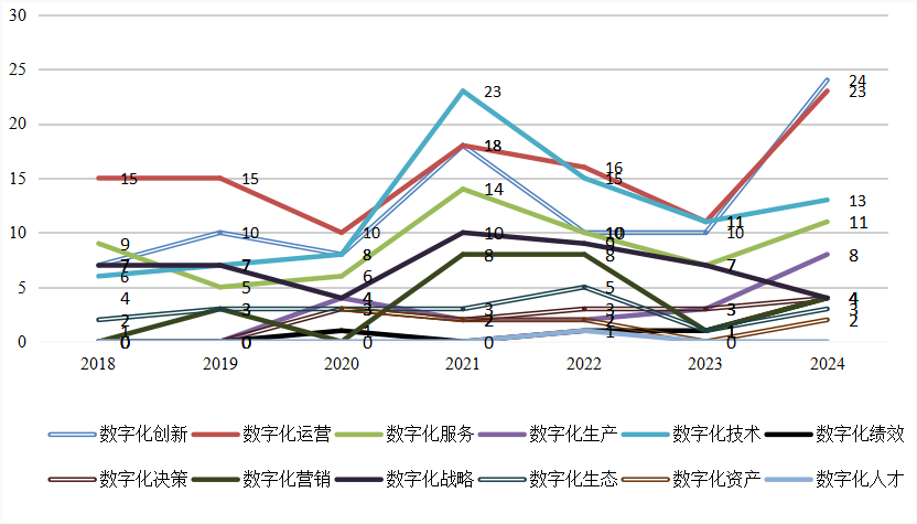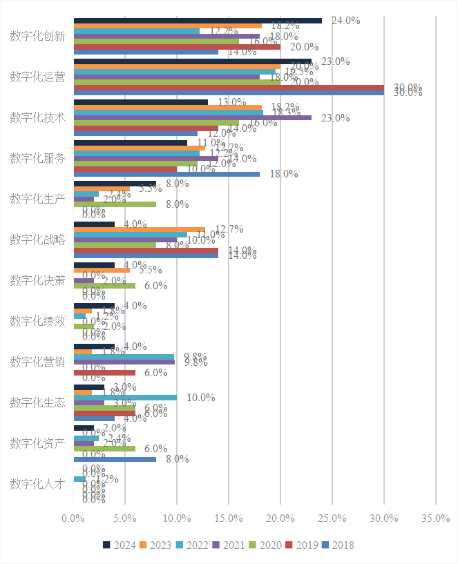从图1可以看出,数字化运营占比最高,2018年和2019年最高,均为30%,2021年占比最低,为18%;其次是数字化创新,2024年最高,为24%,2022年最低为12.2%,;数字化技术在2021年最高,为23%,2018年最低,为12%;数字化服务2021年最高,为14%,2019年最低,为10%;数字化战略2019年最高,为14%,2020年最低,为8%;数字化营销2018年和2020年没有案例,2021年和2022年案例占比最高,均为9.8%;数字化生态在2022年占比最高,为10%;数字化决策,2024年占比最高,为8%;数字化资产2018年最高,为8%;数字化绩效2024年最高,前者为12%,后者为8%;数字人力占比最低。