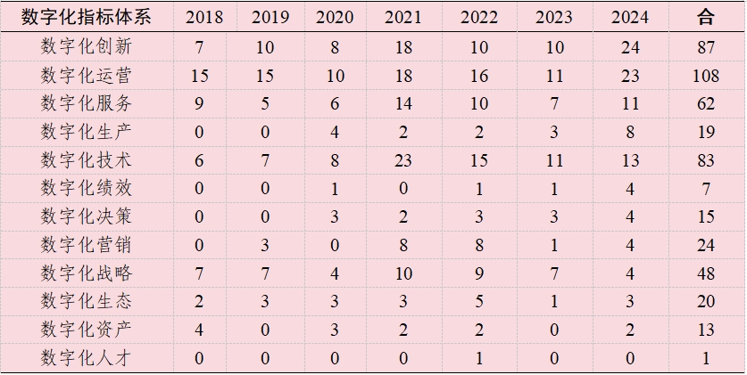 表 2018-2024年每年数字企业指标体系对应获奖案例数