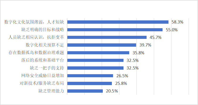 4、39.7%的企业在数字化转型方面的预算投入不足。资金的短缺使得企业在引进先进技术、购置数字工具以及招聘优秀人才等方面捉襟见肘,从而严重影响了转型的质量和效果。同时,预算不足还可能导致数字化项目的延期或被迫中止。
