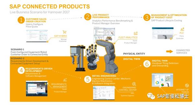 数字化双胞胎(DigitalTwin),最早起源于航空航天业,并与军事工业密切相关。由于航空航天器材的特殊性,对于产品的几何尺寸异常关心,因此最早的数字化双胞胎与三维设计几乎是同义词,这也符合人们对于双胞胎的认识——要长得一模一样。进一步的发展,是将数字化双胞胎等同于三维仿真。应该说,对于某些产品和系统,三维设计和仿真确实是数字化双胞胎的重心。但是,对于绝大多数产品而言,在脱离了设计阶段进入到使用阶段之后,三维设计和仿真并没有太大的实际意义。时至今日,数字化双胞胎早已脱离了几何参数和功能参数阶段,而更加强调全生命周期的双胞胎——也就是数字世界和物理世界的融合,特别是在使用过程中的产品主数据管理和物联网的数据管理,甚至是客户的相关数据。在会场的演示中,SAP围绕着这一概念,以日本三菱的机器人和德国雄克的夹具为例,从产品概念设计阶段的需求管理,到产品设计阶段的成本估算和机械/电子/软件设计,从设计到制造和交付过程的产品资产模型的建立,以及产品的销售过程和使用过程,打造了一整套集成而连贯的产品数据管理体系,即数字总线(Digital Thread),由此来建立与物理世界对应的数字世界。