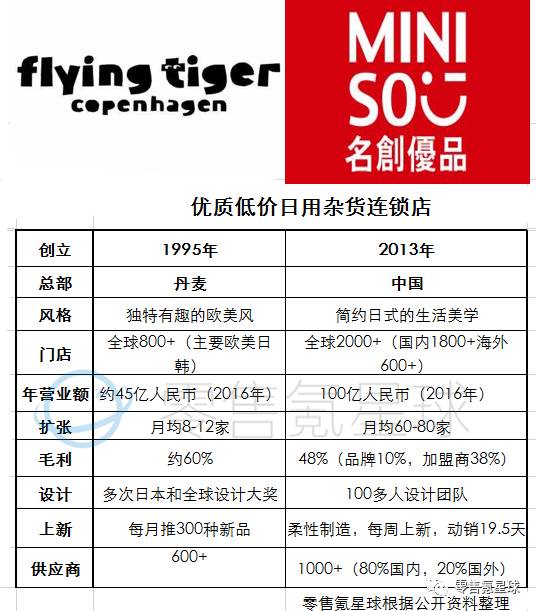 如果从创立日期看,早于8年创办的FlyingTiger算“名创优品”的前辈,但是,得益于“名创优品”的市场更大,背靠中国制造,发展更快,更迅猛。成立3年,其门店数量已经是FlyingTiger的近3倍,其销售额在2016年达到100亿人民币,约是FlyingTiger的2倍多。