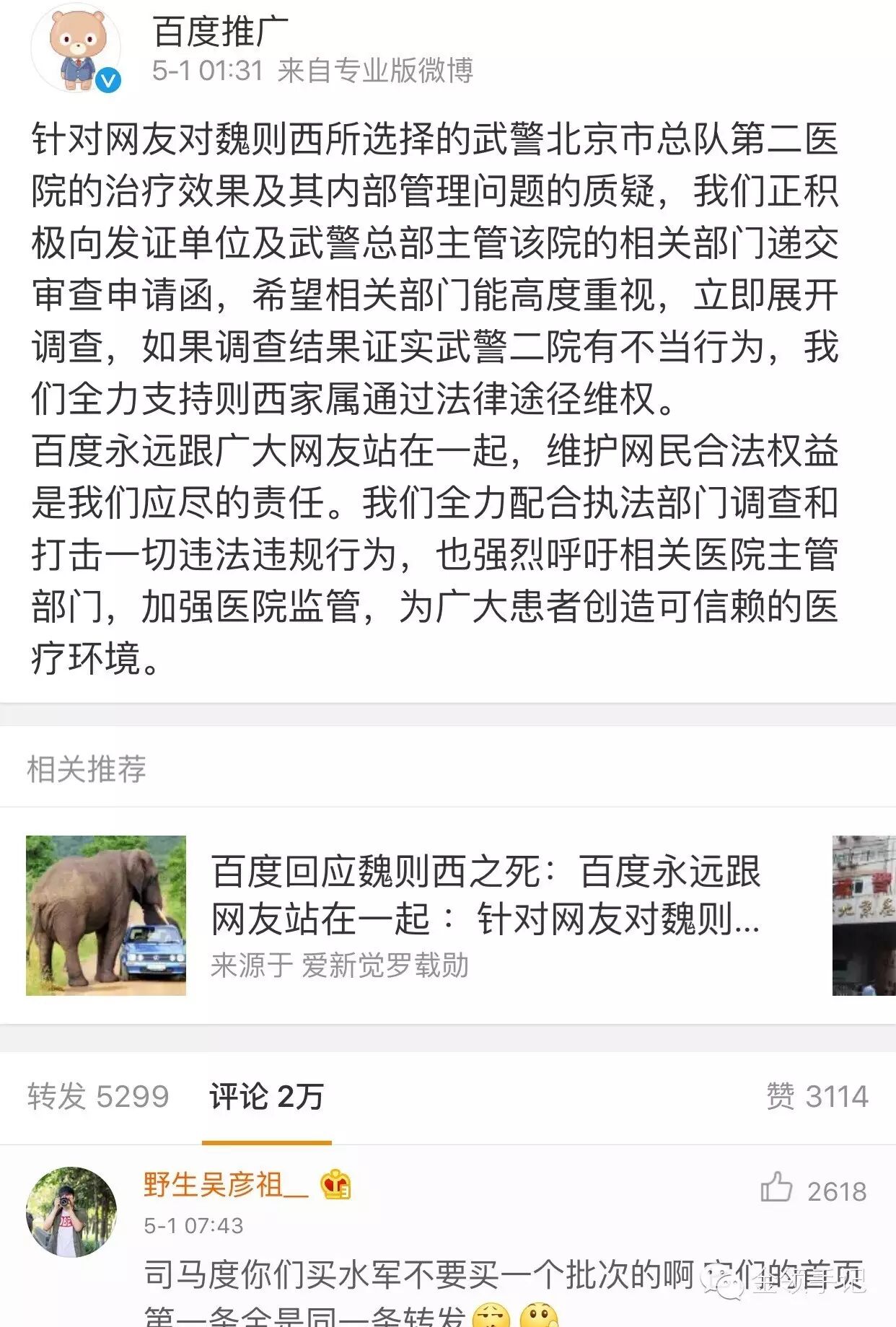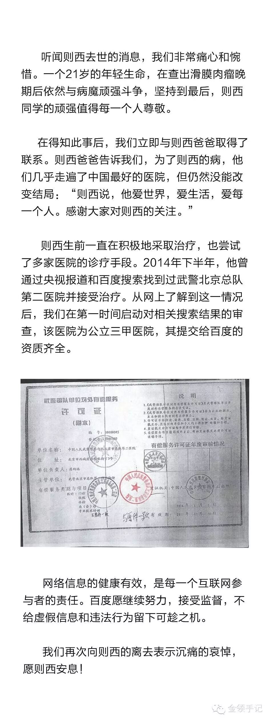 “我们在第一时间启动对相应搜索结果的审查,该医院为公立三甲医院,其提交给百度的资质齐全。”