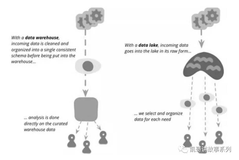 这个解决方案的第一步,是建立基于数据湖的企业全量数据存储能力,为什么是数据湖而非数据仓库?最大的区别在于,数据仓库是抽取明确的对业务目标进行分析的数据,在数据进入数据仓库前,已经被清洗和分类,而数据湖则是全量复制原始数据。图5说明了数据湖和数据仓库的实现区别:
