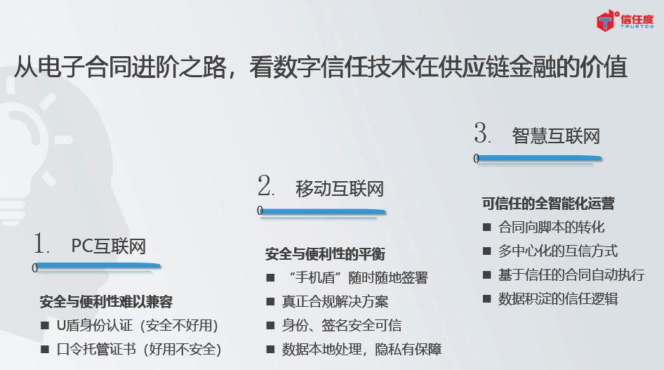 信任度总裁马臣云先生是中国电子签名技术标准的起草人,他认为电子合同的场景应用应该是三个阶段: