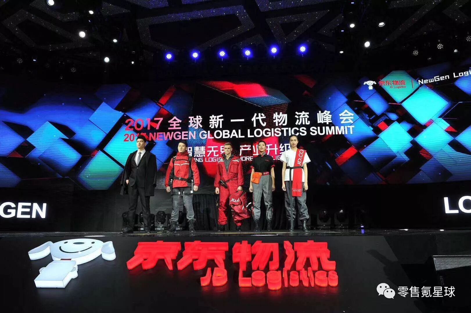 在峰会现场,有一个穿插的走秀,一队来自京东物流一线的“快递小哥”和后勤人员“麻豆”在音乐中上台表演,红色LOGO色冲锋衣制服是京东的标配,但由独立设计师专门的设计演绎,显得更帅气和有范儿。
