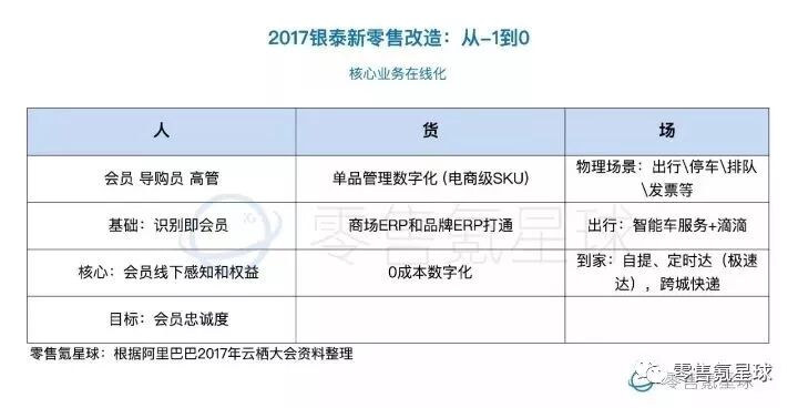 从2014年7月阿里巴巴对银泰的首次投资,到2017年1月,阿里巴巴宣布近200亿港币私有化银泰商业交易。3年间的摸索尝试,银泰和阿里巴巴已摸索出一个将传统百货商场升级改造成一个新零售模式商场的-1 到 0的范本。包括升级改造传统百货商业模式,基础设施在线化,从而使业务具备互联网化升级改造和重构的能力。