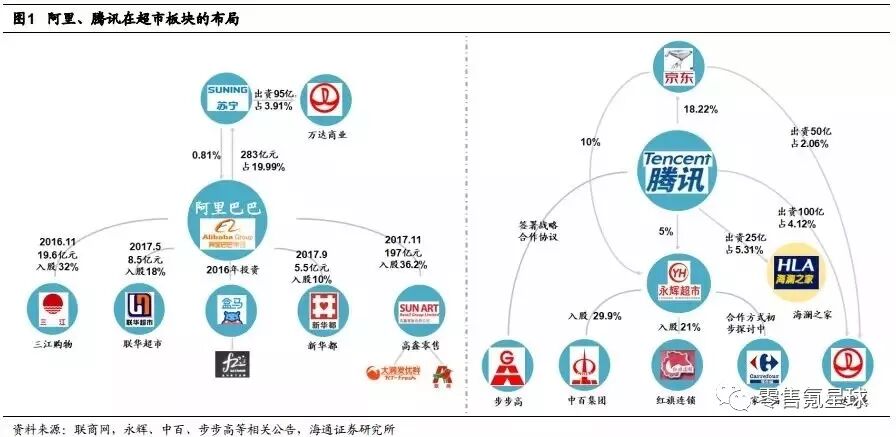 2、阿里和腾讯两巨头在实体零售领域的军备赛将在2018年愈演愈烈,商超主要标的悉数被圈定后,战火必然向服装、餐饮、便利店、购物中心蔓延。