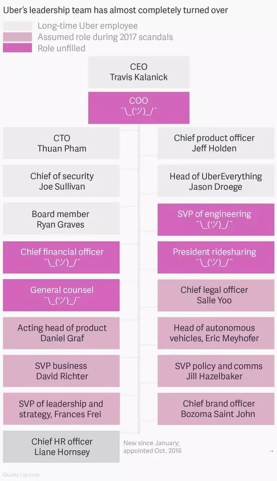 最新Uber管理层结构示意图:浅灰色为Uber长期员工,浅粉色为近期可能上位的高管,水红色为目前职务空缺。图片来源/Quartz