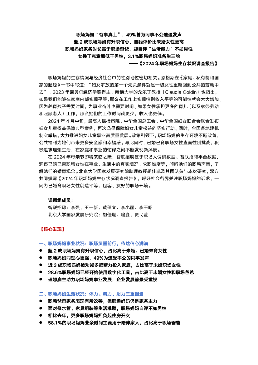 该报告深入探讨了2024年中国职场妈妈面临的挑战与机遇,基于广泛的数据收集和调研,揭示了这一群体在工作与家庭平衡、职业发展路径、心理健康状态等方面的真实情况。研究发现,尽管近年来政策层面对于女性员工尤其是职场妈妈的支持力度有所增强,但她们依然面临着时间管理困难、职业晋升障碍等多重压力。报告还特别关注了技术进步对职场妈妈工作模式的影响,指出远程办公等灵活工作方式为部分职场妈妈提供了更多可能性,同时也带来了新的挑战。此外,通过对不同行业、职位级别职场妈妈的对比分析,报告强调了建立更加包容性企业文化的重要性,并提出了若干建议,旨在帮助企业和个人共同营造一个支持职场妈妈成长与发展的工作环境。最后,报告呼吁社会各界继续加大对职场女性特别是职场妈妈的关注和支持,通过多方面努力改善其生存状况,促进性别平等与社会和谐发展。