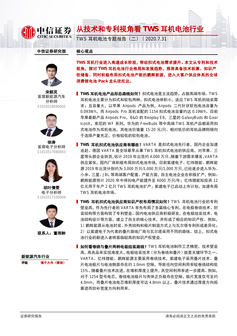 【研报】新能源汽车行业TWS耳机电池专题报告:从技术和专利视角看TWS耳机电池行业-20200731[15页]