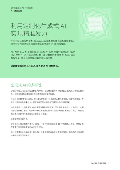 敏捷性方面 提供不同工具:评估基础模型组合,投资部署大型模型以提高生产力,利用专业模型处理特定任务,建立生成式AI全景图和模型地图。 找到最佳匹配:将生成式AI模型与合适的工作流相匹配,根据团队特点选择合适的模型。 成本方面 找到最佳平衡点:为每项任务选择适当规模的模型,培养与模型无关的思维方式,追求效率设计,削减不必要的开支。竞争力方面 让模型更高效运作:持续推动团队利用最新技术和基础架构提升模型性能,提高生成式AI的标准,打造面向未来的AI基础架构。 调查情况:该报告的分析依据是IBM商业价值研究院联合牛津经济研究院对200名美国高管的专项调查,调查时间为2024年6月。 总之,CEO们需要充分了解生成式AI的多样性,认识到模型优化的重要性,并采取相应的行动,以确保企业在生成式AI领域的竞争力