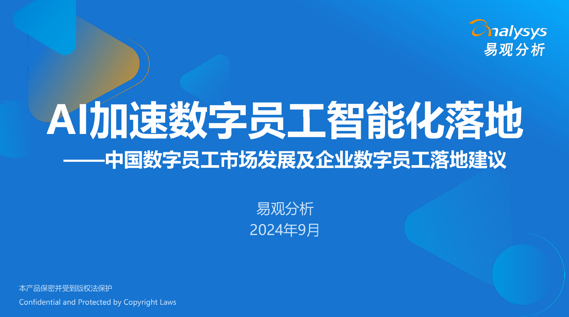 Confidential and Protected by Copyright Laws本产品保密并受到版权法保护AI加速数字员工智能化落地中国数字员工市场发展及企业数字员工落地建议易观分析2024年9月数字员工的定义与概念013激发科技与创新活力2024/9/24数字员工的价值与意义数字员工数据员工系统提 升 企 业 运 营 效 率数字员工可以 24/7 不间断地工作,无需休息、休假或受生物钟影响,能够同时处理多个任务,并且可以快速切换任务,不会出现疲劳或注意力不集中的情况。有 效 降 低 成 本 投 入数字员工可以长期使用,并且,数字员工可以替代多个人工岗位,进一步降低了企业的人力成本。同时,数字员工可以通过预设的程序和算法进行工作,无需进行复杂的培训,大大节省企业的运营成本。更 有 效 保 障 工 作 质 量 与 稳 定 性数字员工不会受到情绪、疲劳、压力等因素的影响,能够始终保持高度的专注和准确。同时,数字员工可以通过严格的程序控制和数据校验,避免人为错误的发生。4激发科技与创新活力2024/9/24数字员工定义数字员工是一种由人工智能、机器学习、自动化流程等技术驱动的虚拟劳动。