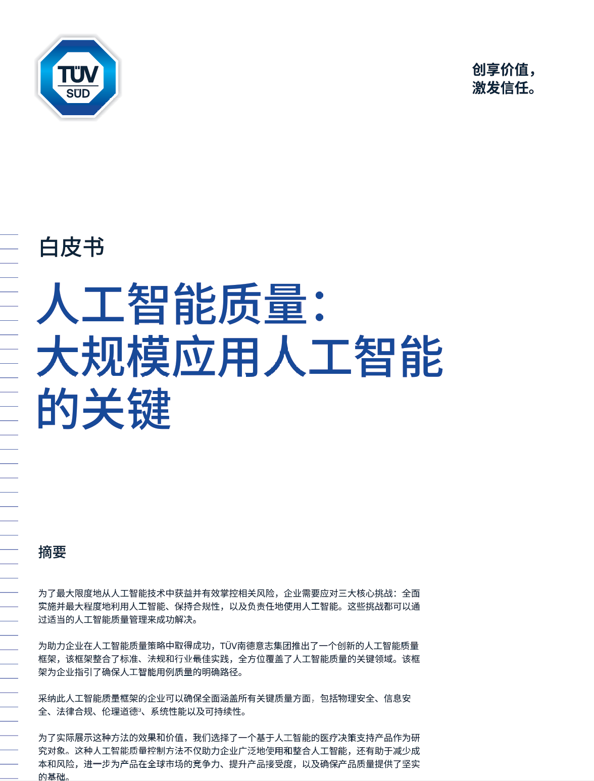 人工智能质量:大规模应用人工智能的关键白皮书摘要为了最大限度地从人工智能技术中获益并有效掌控相关风险,企业需要应对三大核心挑战:全面实施并最大程度地利用人工智能、保持合规性,以及负责任地使用人工智能。这些挑战都可以通过适当的人工智能质量管理来成功解决。为助力企业在人工智能质量策略中取得成功,TV南德意志集团推出了一个创新的人工智能质量框架,该框架整合了标准、法规和行业最佳实践,全方位覆盖了人工智能质量的关键领域。该框架为企业指引了确保人工智能用例质量的明确路径。采纳此人工智能质量框架的企业可以确保全面涵盖所有关键质量方面,包括物理安全、信息安全、法律合规、伦理道德3、系统性能以及可持续性。为了实际展示这种方法的效果和价值,我们选择了一个基于人工智能的医疗决策支持产品作为研究对象。这种人工智能质量控制方法不仅助力企业广泛地使用和整合人工智能,还有助于减少成本和风险,进一步为产品在全球市场的竞争力、提升产品接受度,以及确保产品质量提供了坚实的基础。